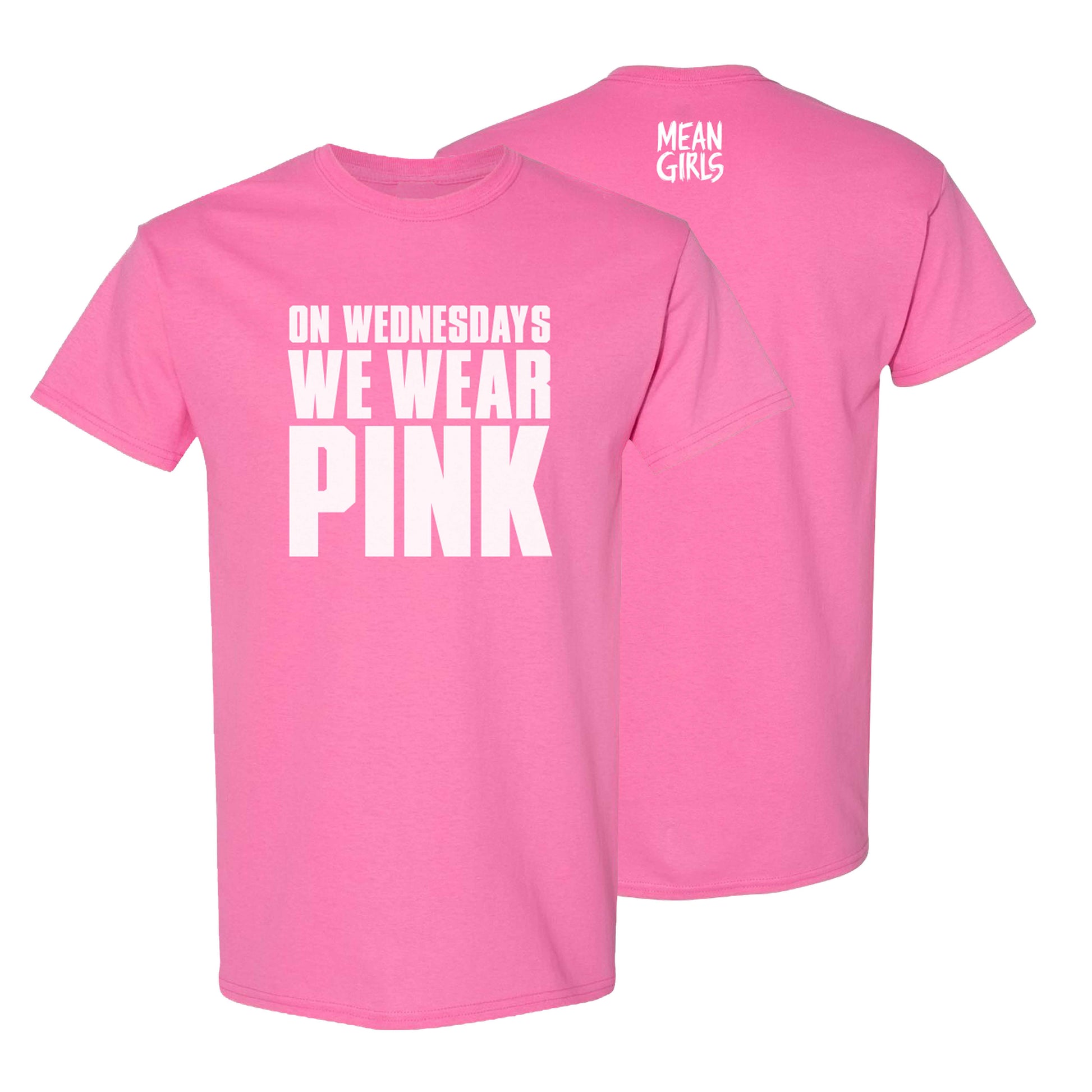 Short-sleeve crewneck T-shirt featuring the iconic line of the show "On Wednesdays We Wear Pink" on the front and "Mean Girls" logo on the back.